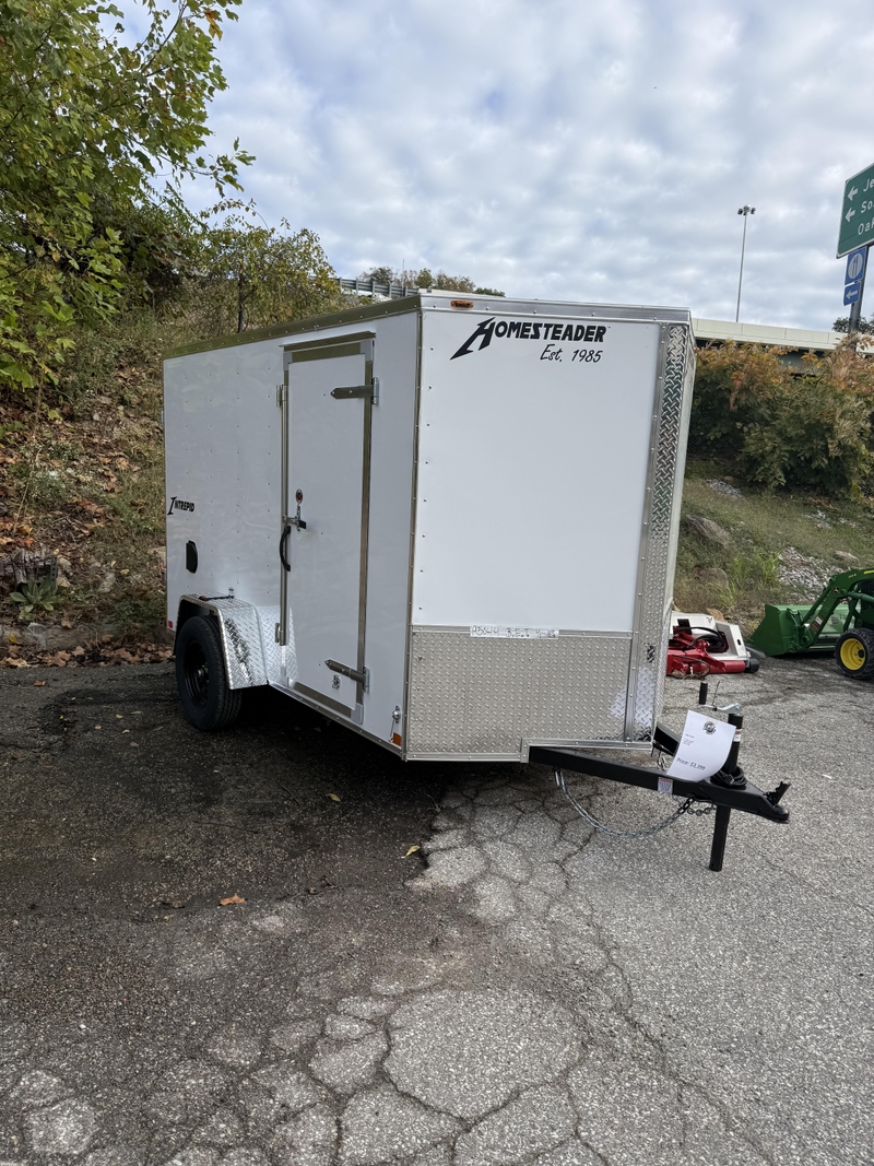 The Homesteader 610IS is a 6-foot by 10-foot enclosed cargo trailer, often part of the Intrepid series, designed for secure storage and transport of items like ATVs or tools. Key features include a steel box frame, an aluminum exterior with a baked enamel finish, a V-nose, a rear ramp door, a side door, a one-piece aluminum roof, and LED lighting. It typically has a single 3,500 lb EZ Lube axle and a 6' or 6'6' interior height.